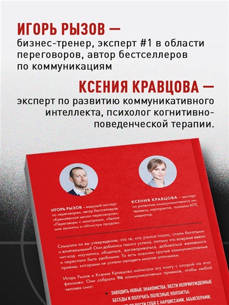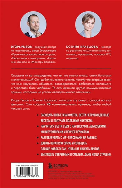 Слышали ли вы утверждение, что те, кто учился плохо, стали богатыми и влиятельными? Они добились такого успеха, потому что вовремя ввели чит-код: научились общаться, договариваться, добиваться желаемого и перестали быть удобными. То есть освоили крутые коммуникативные приемы, которые не успели потренировать многие отличники. Игорь Рызов и Ксения Кравцова написали эту книгу c опорой на этот феномен. Они собрали 96 коммуникативных приемов, чтобы любой человек смог: - заводить новые знакомства, вести непринужденные беседы и получать полезные контакты; - научиться вести себя с нарциссами, абьюзерами, манипуляторами и прочей нечистью; - разговаривать с VIP-персонами на равных; - давать обратную связь и сообщать плохие новости, чтобы не нажить врагов; - выглядеть уверенным и смелым, даже когда страшно.