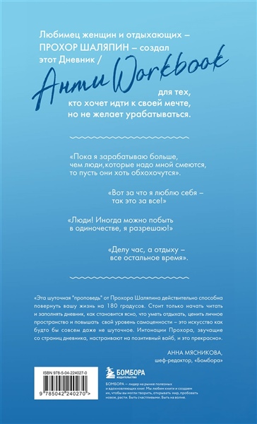 «Эта шуточная "проповедь" от Прохора Шаляпина действительно способна повернуть вашу жизнь на 180 градусов. Стоит только начать читать и заполнять дневник, как становится ясно, что уметь отдыхать, ценить личное пространство и повышатьсвой уровень самоценности — это искусство как будто бы совсем даже не шуточное. Интонации Прохора, звучащиесо страниц дневника, настраивают на позитивный вайб, и это прекрасно». — Анна Мясникова, шеф-редактор, Бомбора