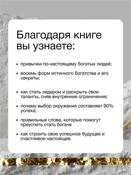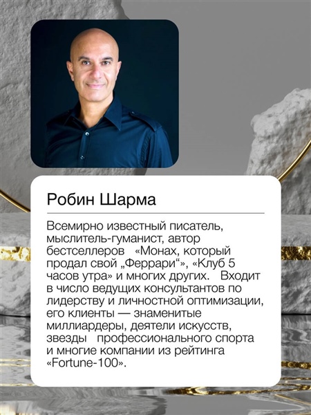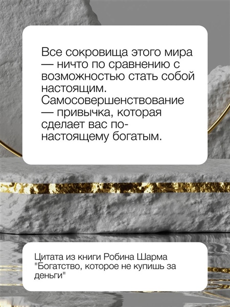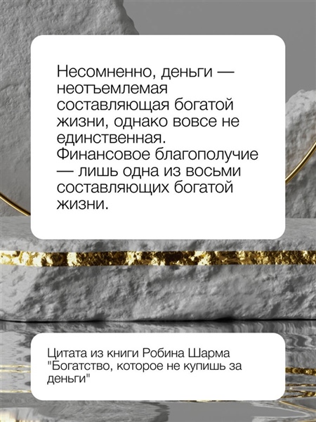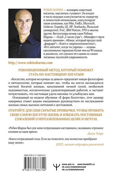 Робин Шарма — всемирно известный писатель, мыслитель-гуманист. Он входит в число ведущих консультантов по лидерству и личностной оптимизации, его клиенты — знаменитые миллиардеры, деятели искусств, звезды профессионального спорта и многие компании из рейтинга "Fortune-100". Новаторская книга Робина Шармы по-новому раскрывает понятие богатства. Вы сможете жить богато и при этом оставаться собой. Откройте эту книгу, доверьтесь наставнику, и вы узнаете, какие восемь привычек присущи по-настоящему богатым людям, как создавать "идеальные моменты" для достижения целей, как наше счастье и процветание зависят от окружающих, и самое главное — как наши проблемы и недостатки можно превратить в источник для процветания и зарабатывания денег. "Богатство, которое не купишь за деньги" предлагает новую философию и методологию, которые изменят вас, чтобы вы могли наслаждаться честной богатой жизнью, наполненной личной силой, необычной подлинностью, исключительно удовлетворяющей работой, и заставят почувствовать, что настоящая удача наконец-то улыбнулась вам.