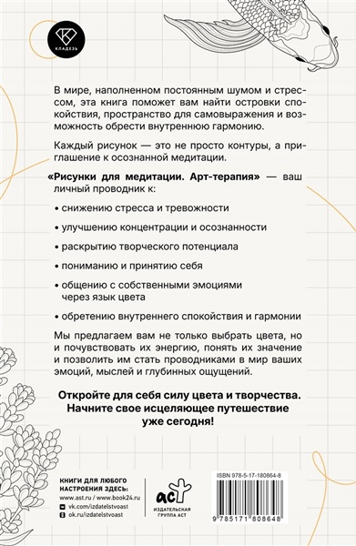 В мире, наполненном постоянным шумом и стрессом, эта книга поможет вам найти островки спокойствия, пространство для самовыражения и возможность обрести внутреннюю гармонию. Каждый рисунок – это не просто контуры, а приглашение к осознанной медитации. "Рисунки для медитации. Арт-терапия" – ваш личный проводник к: • снижению стресса и тревожности • улучшению концентрации и осознанности • раскрытию творческого потенциала • пониманию и принятию себя • общению с собственными эмоциями через язык цвета • обретению внутреннего спокойствия и гармонии Мы предлагаем вам не только выбрать цвета, но и почувствовать их энергию, понять их значение и позволить им стать проводниками в мир ваших эмоций, мыслей и глубинных ощущений. Откройте для себя силу цвета и творчества. Начните свое исцеляющее путешествие уже сегодня!