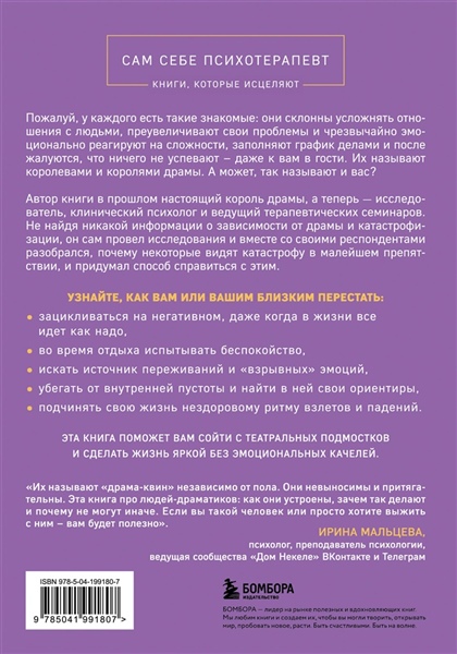 «Находиться рядом с ними утомительно». «Они поглощены только своей собственной историей и будто застряли в ней». «Они слишком остро реагируют на любые события». «Всегда заняты, всегда загружены». Так говорят люди о своих знакомых, склонных излишне драматизировать, — королей и королев драм. Возможно, так говорят и о вас? Возможно, и вы чувствуете себя более живым в моменты дедлайна, привлекаете к себе внимание, чтобы не чувствовать неприятные эмоции, и чередой срочных дел заполняете ощущение пустоты. Работая с этой книгой, вы перестанете: - Зацикливаться на негативном, даже когда в жизни все идет как надо. - Превращать отдых, спокойствие и тишину в источник беспокойства. - Искать источник переживаний и «взрывных» эмоций. - Убегать от внутренней пустоты и найти в ней свои ориентиры. - Подчинять свою жизнь нездоровому ритму взлетов и падений. Автор книги Скотт Лайонс утверждает, что склонность драматизировать вполне можно преодолеть, он сам разработал программу, которая помогла ему выйти из образа и без преувеличения ощутить полноту жизни.