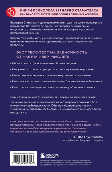 Если хотя бы одна из этих навязчивых мыслей регулярно вас посещает, то эта книга для вас. - Я боюсь, что окружающие плохо обо мне подумают. - Я не умею расставлять приоритеты, поэтому ничего не успеваю. - Я не до конца понимаю, кто я и чем хочу заниматься по жизни. - Я не слежу за своими словами, из-за чего близкие на меня обижаются. - Я часто испытываю чувство вины, но не могу объяснить причину. Такие мысли-вампиры высасывают из нас энергию, причиняют боль и подчиняют себе наши жизни. Обычно с большинством таких убеждений мы справляемся быстро, но некоторые из них могут долго изводить нас. Бернардо Стаматеас — доктор психологии, один из самых популярных психологов Латинской Америки. Его по праву считают самым искусным охотником на навязчивые мысли, которые мешают нам наслаждаться жизнью. Вместо того чтобы идти у них на поводу, Стаматеас предлагает методы изменения мышления и альтернативные взгляды на привычные проблемы.