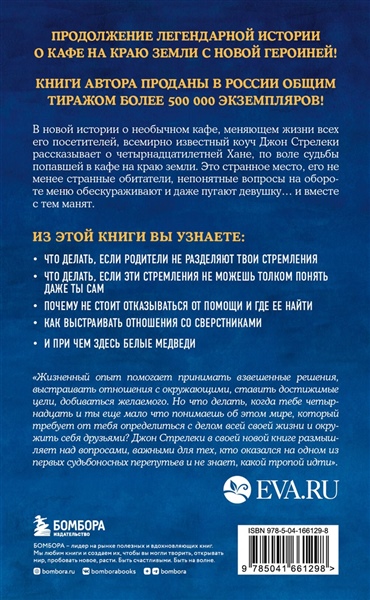 ПРОДОЛЖЕНИЕ ЛЕГЕНДАРНОЙ СЕРИИ «КАФЕ НА КРАЮ ЗЕМЛИ»!КНИГИ АВТОРА ОТПЕЧАТАНЫ СУММАРНЫМ ТИРАЖОМ В РОССИИ БОЛЕЕ 500 000 ЭКЗЕМПЛЯРОВ!ДОЛГОЖДАННАЯ НОВИНКА ДЖОНА СТРЕЛЕКИ!В новой истории о необычном кафе, меняющем жизни всех его посетителей, всемирно известный коуч Джон Стрелеки рассказывает о четырнадцатилетней Хане, по воле судьбы попавшей в кафе на краю земли. Это странное место, его не менее странные обитатели, непонятные вопросы на обороте меню обескураживают и даже пугают девушку… и вместе с тем манят.Из этой книги вы узнаете:- Что делать, если родители не разделяют твои стремления?- Что делать, если эти стремления не можешь толком понять даже ты сам?- Почему не стоит отказываться от помощи и где ее найти?- Как выстраивать отношения со сверстниками? - И при чем здесь белые медведи?