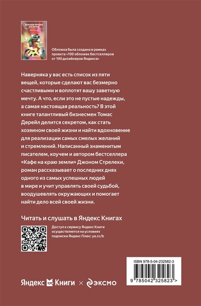 Наверняка у вас есть список из пяти вещей, которые сделают вас безмерно счастливыми и воплотят вашу заветную мечту. А что, если это не пустые надежды, а самая настоящая реальность? В этой книге талантливый бизнесмен Томас Дерейл делится секретом, как стать хозяином своей жизни и найти вдохновение для реализации самых смелых желаний и стремлений. Написанный знаменитым писателем, коучем и автором бестселлера "Кафе на краю земли" Джоном Стрелеки, роман рассказывает о последних днях одного из самых успешных людей в мире и учит управлять своей судьбой, воодушевлять окружающих и помогает найти дело всей своей жизни.