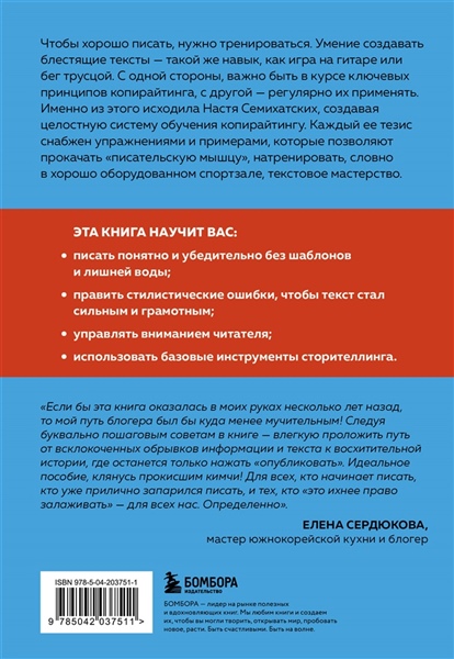 Чтобы хорошо писать, нужно тренироваться. Умение создавать блестящие тексты — такой же навык, как игра на гитаре или бег трусцой. С одной стороны, важно быть в курсе ключевых принципов копирайтинга, с другой — регулярно их применять. Именно из этого исходила Настя Семихатских, создавая целостную систему обучения копирайтингу. Каждый ее тезис снабжен упражнениями, которые позволяют прокачать «писательскую мышцу», натренировать, словно в хорошо оборудованном спортзале, текстовое мастерство.