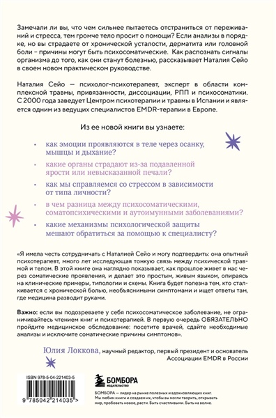 Мы не впервые слышим о том, что наши переживания могут вызвать физические проблемы со здоровьем: хроническую боль при грусти, расстройство пищеварения при волнении, снижение иммунитета при стрессе. Тело беспрестанно перерабатывает наши чувства через нейромедиаторы, но мы не в силах сразу считать сигналы. Наталия Сейо – психолог и эксперт в области психосоматики подробно объясняет, как устроена взаимосвязь тела и психики. Вы поймете, как различать психосоматические и аутоиммунные заболевания, как перестать подавлять эмоции и как освободиться от травм прошлого.