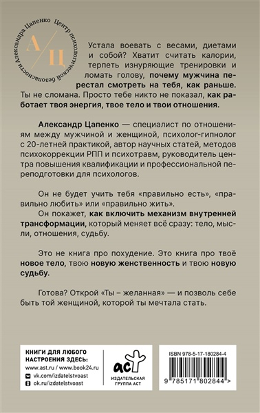 Устала воевать с весами, диетами и собой? Хватит считать калории, терпеть изнуряющие тренировки и ломать голову, почему мужчина перестал смотреть на тебя, как раньше. Ты не сломана. Просто тебе никто не показал, как работает твоя энергия, твое тело и твои отношения. Александр Цапенко – специалист по отношениям между мужчиной и женщиной, психолог-гипнолог с 20-летней практикой, автор научных статей, методов психокоррекции РПП и психотравм, руководитель центра повышения квалификации и профессиональной переподготовки для психологов. Он не будет учить тебя "правильно есть", "правильно любить" или "правильно жить". Он покажет, как включить механизм внутренней трансформации, который меняет всё сразу: тело, мысли, отношения, судьбу. Это не книга про похудение. Это книга про твоё новое тело, твою новую женственность и твою новую судьбу. Готова? Открой "Ты – желанная" — и позволь себе быть той женщиной, которой ты мечтала стать.