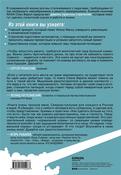 В своей дебютной книге бывший инженер NASA Озан Варол раскрывает девять простых стратегий, которыми пользуются астронавты и такие новаторы, как Илон Маск. Используйте и вы их в своей жизни: будь то получение работы вашей мечты, ускорение вашего бизнеса, изучение нового навыка или создание следующего прорывного продукта. Все мы сталкиваемся в своей жизни со сложными и незнакомыми проблемами. Те, кто может справиться с возникающими задачами самостоятельно, без стресса и точно в срок, пользуются огромным преимуществом и добиваются огромных успехов. Дерзайте!