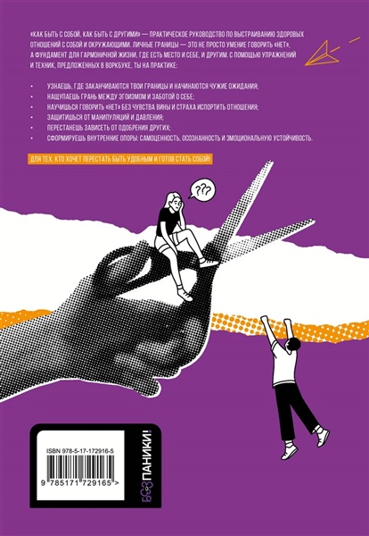Ольга Викторова — клинический психолог, работает с детьми и их родителями в ДокДети и ДокМед. Является членом Ассоциации когнитивно-поведенческой психотерапии и Ассоциации специалистов в сфере контекстуально-поведенческой науки. В своей работе использует такие подходы, как когнитивно-поведенческая терапия (КПТ), краткосрочная позитивная психотерапия, ориентированная на решения, а также терапия принятия и ответственности (АСТ). Помогает улучшить качество жизни и справиться со сложностями во взаимоотношениях с окружающими людьми, негативными эмоциями, тревожными и депрессивными мыслями. "Как быть с собой, как быть с другими" — практическое руководство по выстраиванию здоровых отношений с собой и окружающими. Личные границы — это не просто умение говорить "нет", а фундамент для гармоничной жизни, где есть место и себе, и другим. С помощью упражнений и техник, предложенных в воркбуке, ты на практике: • узнаешь, где заканчиваются твои границы и начинаются чужие ожидания; • нащупаешь грань между эгоизмом и заботой о себе; • научишься говорить "нет" без чувства вины и страха испортить отношения; • защитишься от манипуляций и давления; • перестанешь зависеть от одобрения других; • сформируешь внутренние опоры: самоценность, осознанность и эмоциональную устойчивость. Для тех, кто хочет перестать быть удобным и готов стать собой! Внутри вы найдете стикеры с яркими иллюстрациями и жизнеутверждающими фразами.