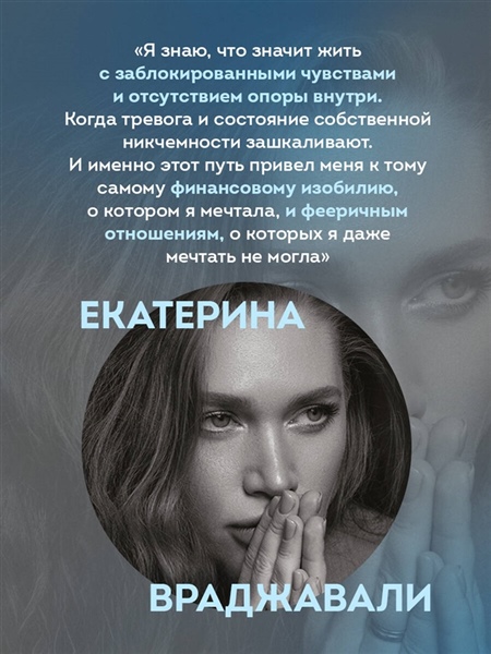 «Я знаю, что значит жить с заблокированными чувствами и отсутствием опоры внутри. Когда тревога и состояние собственной никчемности зашкаливают. И именно этот путь привел меня к тому самому финансовому изобилию, о котором я мечтала, и фееричным отношениям, о которых я даже мечтать не могла». — ЕкатеринаВраджавали