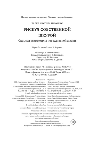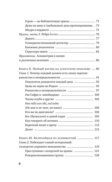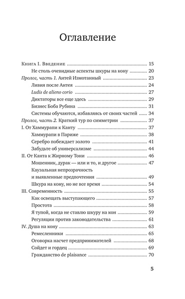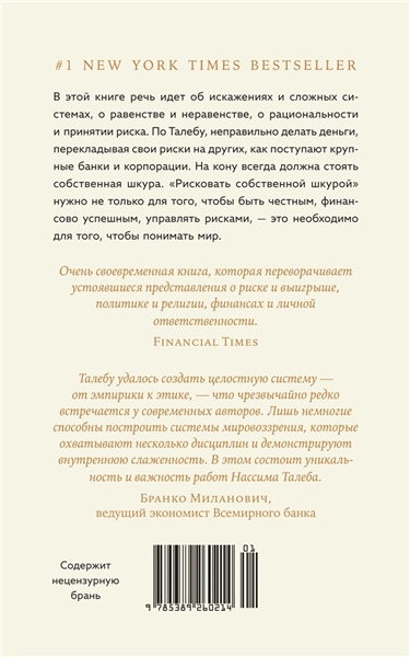 В своей резко провокационной и одновременно предельно прагматичной книге неподражаемый Нассим Талеб рассказывает, как важно идентифицировать и фильтровать чушь, отличать теорию от практики, поверхностную компетентность от настоящей. Вы узнаете, что такое рациональность в сложных системах и реальном мире, симметрия и асимметрия и в чем состоит логика принятия рисков. Наполняя новым смыслом привычные понятия, такие как «справедливое общество», «профессиональный успех», «личная ответственность», и не боясь задеть эго признанных кумиров, Талеб развенчивает лицемерие идеологов военных интервенций в Ирак и Ливию; фиаско нобелевских лауреатов по экономике, разоривших банки и инвестиционные фонды; лживых религиозных проповедников. На примерах Хаммурапи и Иисуса Христа, римских и византийских императоров, философов-стоиков и современных успешных бизнесменов Талеб показывает, что главное качество, объединяющее их всех, — «ставить на кон свою шкуру и душу», а не переносить риск на других.