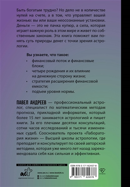 Быть богатым трудно? Но дело не в количестве нулей на счете, а в том, что управляет вашей жизнью: вы или ваши неосознанные установки. Деньги — это не пачка купюр, а сила, которая играет важную роль в этом мире и живет по собственным законам. Эта книга поможет вам понять суть природы денег с точки зрения астрологии. Вы узнаете, что такое: • финансовый поток и финансовые блоки; • четыре рождения и каково их влияние на денежную сторону жизни; • стратегия расширения финансовой емкости; • подъем уровня нормы. Павел Андреев — профессиональный астролог, специалист по математическим методам прогноза, прикладной информатик, который более 15 лет занимается астрологией и пишет книги. За его плечами десятки консультаций, сотни часов исследований и тысячи измененных судеб. Сооснователь проекта "Лаборатория жизни" — Высшей школы астрологии, где преподает и консультирует по своей авторской методике, которая уже много лет назад зарекомендовала себя как сильная и эффективная.