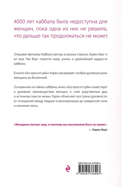 Карен Берг, вдохновитель и содиректор Каббала Центра, —первая женщина, которая, невзирая на запрет, не только начала изучать каббалу, но и нашла в себе смелость сделать ее доступной для всех женщин мира. В своей книге Карен в свойственной ей легкой манере излагает суть мудрости каббалы и объясняет, как женщины могут использовать эти знания в своей жизни. Как любить, но не унижаться? Действительно ли события в нашей жизни предопределены? В чем превосходство и сила женщин? Как "запланировать" счастливого ребенка? Присоединитесь к этому удивительному путешествию, и оно приведет вас к духовному озарению и наполнит вашу жизнь внутренним спокойствием и уверенностью.