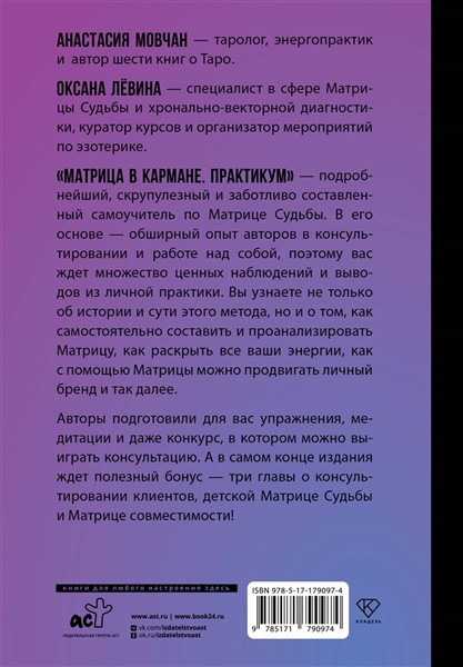 Анастасия Мовчан — таролог, энергопрактик и автор шести книг о Таро. Оксана Лёвина — специалист в сфере Матрицы Судьбы и хронально-векторной диагностики, куратор курсов и организатор мероприятий по эзотерике.