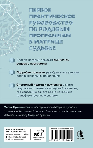 Мария Приемыхова — мастер метода "Матрица судьбы" с опытом работы в этой системе более пяти лет. Автор книги "Обучение методу Матрица судьбы".