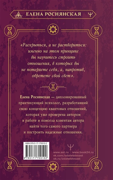 1. Елена Роснянская — дипломированный практикующий психолог, разработавший свою концепцию квантовых отношений, которая уже проверена автором в работе.