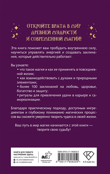 Откройте врата в мир древней мудрости и современной магии! Эта книга поможет вам пробудить внутреннюю силу, научиться управлять энергией и создавать заклинания, которые действительно работают. Вы узнаете: • Что такое магия и как ее применять в повседневной жизни • Как взаимодействовать с духами и природными элементами • Более 100 заклинаний на любовь, здоровье, богатство и защиту • Ритуалы для привлечения удачи в карьере и самореализации Благодаря практическому подходу, доступным ингредиентам и глубокому пониманию магических процессов вы сможете уверенно творить чудеса в своей жизни. Ваш путь в мир магии начинается с этой книги – творите свою судьбу!