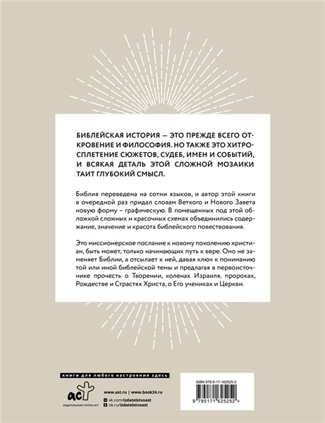 Библейская история — это, прежде всего, откровение и философия. Но также это хитросплетение сюжетов, судеб, имен и событий, и всякая деталь этой сложной мозаики таит глубокий смысл. Библия переведена на сотни языков, и авторы этой книги в очередной раз придали словам Ветхого и Нового Заветов новую форму — графическую. В помещенных под этой обложкой сложных и красочных схемах объединились содержание, значение и красота библейского повествования.