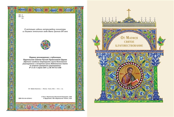 Уникальное издание Святого Евангелия в подарочном оформлении! Обложка покрыта бархатной тканью с золотым тиснением. Обрез серебряный, внутри цветные гравюры из Лицевого летописного свода Иоанна Грозного на плотной мелованной бумаге!