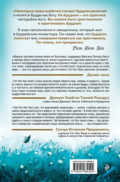 Последняя книга Тит Нат Хана, в которой собраны его учения о человечности, экологии, искусстве заботы о планете и построении здорового и гуманного общества. Книга включает практические медитации, призванные помочь привнести желанные перемены в жизнь. Тит Нат Хан (1926-2022) – легендарный буддийский монах из Вьетнама, миротворец и автор более ста книг по дзен буддизму – является одним из самых влиятельных духовных лидеров современности.