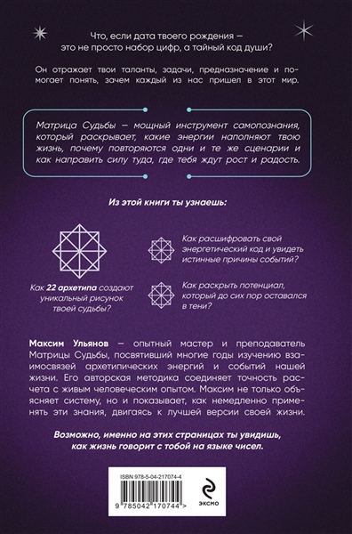 Что, если дата твоего рождения — это не просто набор цифр, а тайный код души? Он отражает твои таланты, задачи, предназначение и помогает понять, зачем каждый из нас пришел в этот мир. Матрица Судьбы — мощный инструмент самопознания, который раскрывает, какие энергии наполняют твою жизнь, почему повторяются одни и те же сценарии и как направить силу туда, где тебя ждут рост и радость. Из этой книги ты узнаешь: • Как 22 архетипа создают уникальный рисунок твоей судьбы. • Как расшифровать свой энергетический код и увидеть истинные причины событий. • Как раскрыть потенциал, который до сих пор оставался в тени. Максим Ульянов — опытный мастер и преподаватель Матрицы Судьбы, посвятивший многие годы изучению взаимосвязей между архетипическими энергиями и событиями нашей жизни. Его авторская методика соединяет точность расчета с живым человеческим опытом. Максим не только объясняет систему, но и показывает, как немедленно применять эти знания, двигаясь к лучшей версии своей жизни. Возможно, именно на этих страницах ты увидишь, как жизнь говорит с тобой на языке чисел.