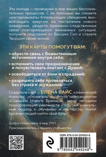 Как найти опору внутри себя? Как позволить себе проявляться без страха осуждения и при этом достигать желаемого результата? Перед вами — особенные исцеляющие метафорические карты, созданные клиническим психологом и автором уникальной методики трансформации реальности PWS, Еленой Вайс. Карты помогут вам по-новому посмотреть на ситуации своей жизни, травмы, переживания. Почувствовать контакт со своей душой, со своим истинным «Я». На каждой карте — загрузка-подсказка, которая поможет обрести новые смыслы, новый взгляд на мир и трансформировать свою жизнь.