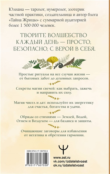 Юлиана — таролог, нумеролог, эзотерик частной практики, создательница и автор блога "Тайна Жрицы" с суммарной аудиторией более полутора миллионов человек. Начните творить волшебство здесь и сейчас, доверьтесь мудрости этой книги и собственной интуиции. "Настольная книга белой магии" — сборник проверенных практик от опытного и известного мастера магии, знаниям которого доверяют тысячи людей. На страницах книги она делится с читателями простыми, доступными и, главное, безопасными, ритуалами, обрядами и заговорами на каждый день и все случаи жизни — от бытовых до духовных запросов. Откройте книгу и найдите именно то, что требуется в данный момент: привлечь удачу, сохранить покой в семье или обрести ясность мысли. Этот сборник станет помощником как для новичков, только вступающих на путь магии, так и для опытных практиков, желающих углубить свои познания. Впустите в свою жизнь магию стихий, свечей и чисел, чтобы она помогла мягко и безопасно преобразовать реальность вокруг вас. Внутри книги вы найдете: • простые ритуалы на все случаи жизни — от бытовых забот до духовных запросов; • секреты магии свечей — как выбрать, зажечь и направить их силу; • магию чисел и дат — используйте их энергетику для счастья, богатства и удачи; • обряды со стихиями — Землей, Водой, Огнем и Воздухом — для баланса и защиты; • очищающие заговоры для избавления от негатива и обретения гармонии.
