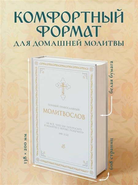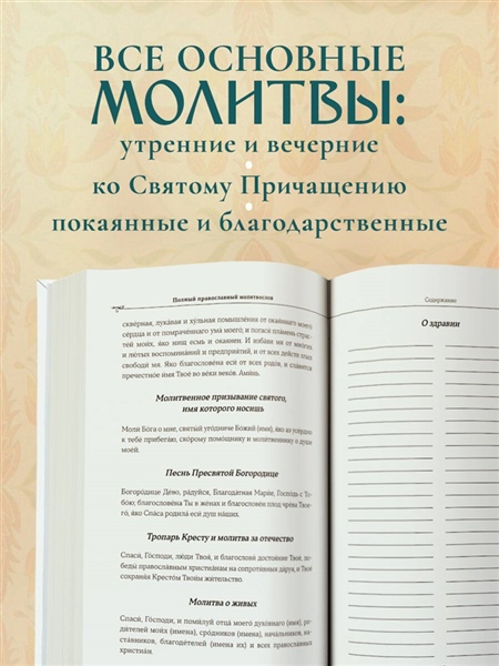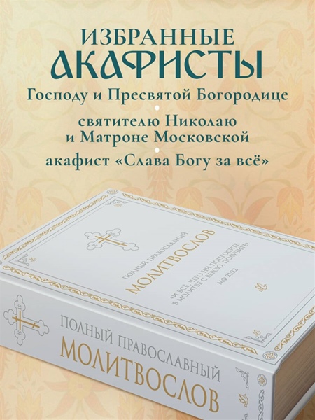 Полный православный молитвослов — настольная книга каждого верующего, сопровождающая его в буднях и праздниках, в радости и скорби. В нём собраны все основные молитвы на каждый день: утреннее и вечернее правило, покаянный канон ко Господу Иисусу Христу, канон Ангелу-Хранителю, последование ко Святому Причащению и благодарственные молитвы после Причастия. Раздел «Молитвы на всякую потребу» включает прошения о здравии и в болезни, о семье и детях, о путешествующих, о доме, о мире и Отечестве, в скорбях и искушениях, а также молитвы перед выходом из дома, перед сном, на Новый год и день рождения. В молитвослов входят акафисты Господу Иисусу Христу, Пресвятой Богородице (в честь икон Всецарица, Неупиваемая Чаша, Всех скорбящих Радость), святителю Николаю Чудотворцу, праведному Иоанну Кронштадтскому, блаженной Матроне Московской, царственным страстотерпцам, а также благодарственный акафист «Слава Богу за всё». Тексты приведены по богослужебным изданиям Русской Православной Церкви в современной орфографии, что делает чтение доступным и удобным. Молитвослов адресован мирянам, воцерковлённым христианам, начинающим верующим и пожилым людям — всем, кто стремится к живой молитве и духовной поддержке. Благодаря современному и стильному оформлению, качественной печати и удобному формату издание станет душевным и достойным православным подарком для родных, друзей, крестников и коллег на Рождество, Пасху, именины, венчание или любой духовный праздник. Молитвослов полный, православный, с акафистами — на каждый день и на все случаи жизни.