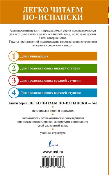 Пособие предназначается для начинающих изучать испанский язык (уровень 1 — для начинающих А1–А2). Небольшой формат издания позволяет читать произведение как дома, так и в поездке.