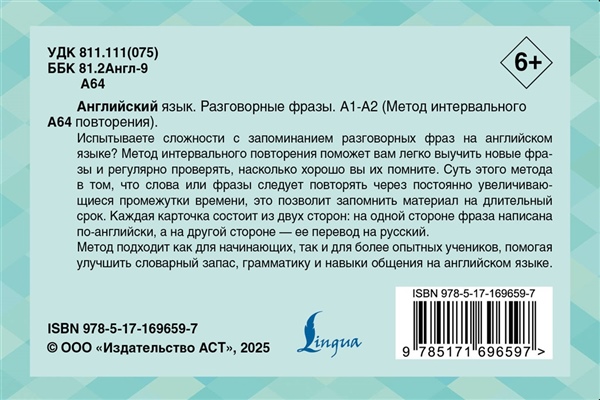 Испытываете сложности с запоминанием разговорных фраз на английском языке? Метод интервального повторения поможет вам легко выучить новые фразы и регулярно проверять, насколько хорошо вы их помните. Суть этого метода в том, что слова или фразы следует повторять через постоянно увеличивающиеся промежутки времени, это позволит запомнить материал на длительный срок. Каждая карточка состоит из двух сторон: на одной стороне фраза написана по-английски, а на другой стороне — ее перевод на русский. Метод подходит как для начинающих, так и для более опытных учеников, помогая улучшить словарный запас, грамматику и навыки общения на английском языке.