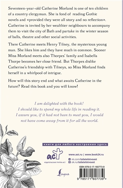 Кэтрин – главная героиня романа Джейн Остен "Нортенгерское аббатство" - увлечена произведениями Анны Радклифф и часто представляет, будто живет в одном из них. Поэтому наивная девушка все воспринимает через призму своих фантазий, ей везде мерещатся страшные тайны. Обеспеченные соседи берут Кэтрин с собой в Бат. Там она знакомится с загадочным мистером Генри Тилни, который становится для девушки интереснейшим собеседником. Он видится девушке неким таинственным персонажем романа. Позже Кэтрин знакомится еще и с Торпами, после чего на самом деле оказывается в водовороте интриг. Пройдите вместе с Кэтрин путь от мечтаний к реальному миру, читая "Нортенгерское аббатство" в оригинале.