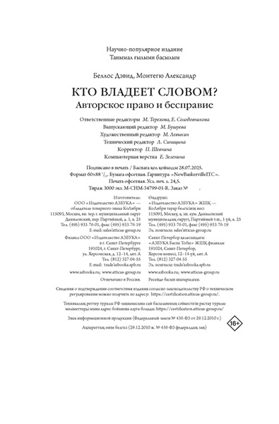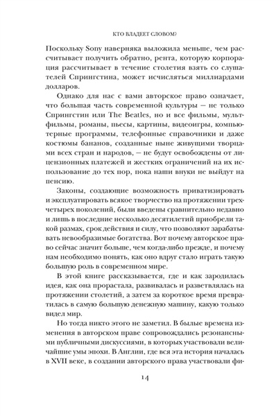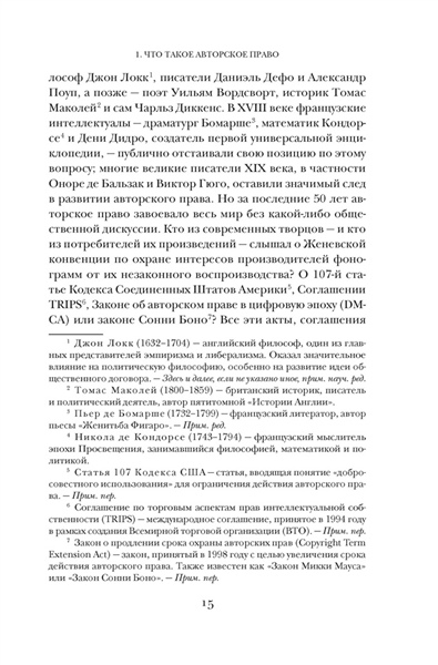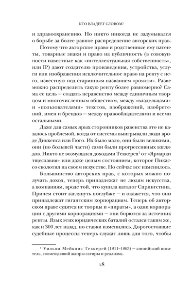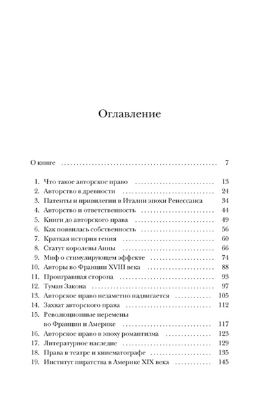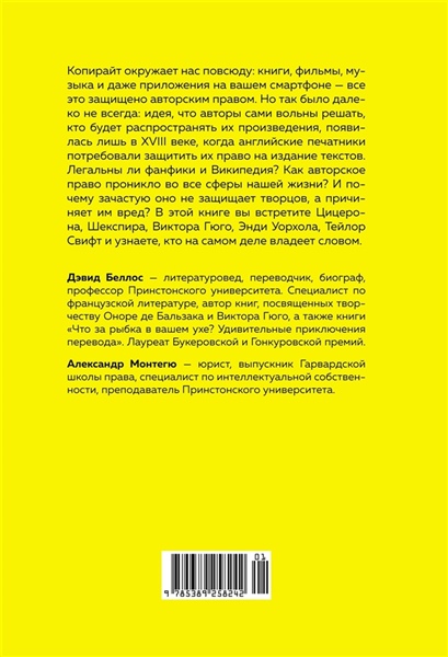 В книге, которую вы держите в руках, прямо под этим текстом вы найдете выразительный знак ©. Права на текст оригинала принадлежат авторам. Права на русскоязычный текст — переводчику. Права на книгу в ее физическом или электронном воплощении — издательству. Сегодня крупные корпорации владеют исключительными правами на произведения искусства, к созданию которых они не имели никакого отношения. Изображение вашего лица может принадлежать не вам, а фотографу, который его сделал. А прямо сейчас писатели и художники борются за права на контент, который создает обученный на их творчестве искусственный интеллект. Почему Вергилия обвиняли в плагиате? Кто подал в суд на Тейлор Свифт? Как связаны «Отверженные» и The Beatles? И почему произведения Пушкина стали доступны общественности лишь в конце XIX века? Литературовед Дэвид Беллос и юрист Александр Монтегю объединили силы, чтобы выяснить, как возникла идея копирайта и почему право на интеллектуальную собственность понадобилось защищать. В их увлекательном и ироничном повествовании нашлось место спорам античных мыслителей, старым английским законам, западной поп-музыке и махинациям лоббистов. «Веками велась ожесточенная борьба за более справедливое распределение земли. Целью революций провозглашалось перераспределение природных ресурсов и средств производства. Партии и политики призывали к более справедливому доступу к жилью, образованию и здравоохранению. Но никто никогда не задумывался о борьбе за более равное распределение авторских прав» (Дэвид Беллос, Александр Монтегю).
