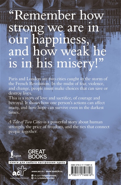 "Повесть о двух городах" — один из самых известных романов Чарльза Диккенса, действие которого разворачивается на фоне Великой французской революции. История охватывает судьбы людей, живущих в Лондоне и Париже, в эпоху, когда мир оказался расколот между жестокостью и надеждой, отчаянием и возрождением.