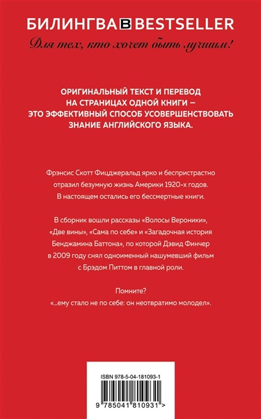 Фрэнсису Скотту Фицджеральду принадлежит, пожалуй, одна из ведущих сольных партий в оркестровой партитуре "века джаза". Писатель, ярче и беспристрастней которого вряд ли кто отразил безумную жизнь Америки 20-х годов, и сам был плотью от плоти той легендарной эпохи, его имя не сходило с уст современников и из сводок светских хроник. Его скандальная манера поведения повергала в ужас одних и вызывала восторг у других. Но эксцентричность и внешняя позолота канули в прошлое, и в настоящем остались его бессмертные книги.В сборникенесколько лучших рассказов и"Загадочная история Бенджамина Баттона", по которой Дэвид Финчер в 2009 году снял одноименный нашумевший фильм с Брэдом Питтом в главной роли."Страх старения присущ всем людям.Многие втайне мечтают о вечной молодости. Но юность, проведенная в теле старикабезрадостна."