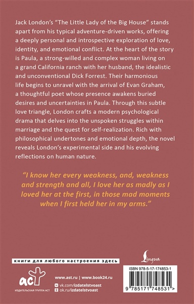 "Маленькая хозяйка большого дома" — один из самых глубоких и психологически тонких романов Джека Лондона. В центре сюжета — Паула, сильная и независимая женщина, разрывающаяся между любовью к мужу и внезапным чувством к другому мужчине. На фоне живописной природы Калифорнии разворачивается драма человеческих чувств, где сталкиваются долг, страсть и стремление к личной свободе. Роман отличается богатым внутренним миром персонажей, философской глубиной и зрелым стилем автора, став ярким примером перехода Лондона от приключенческой прозы к серьёзной психологической литературе.