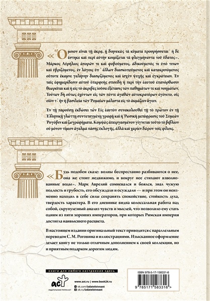 "Будь подобен скале: волны беспрестанно разбиваются о нее, она же стоит недвижимо, и вокруг нее стихают взволнованные воды". Марк Аврелий сомневался и боялся, знал чужую подлость и грубость, его обсуждали и осуждали — и при этом он неизменно находил в себе силы сохранять спокойствие, стойкость духа, твердость характера. В его дневнике видна колоссальная работа над собой, скрупулезный анализ чувств и мыслей, что позволило ему стать одним из пяти хороших императоров, при которых Римская империя достигла наивысшего расцвета.