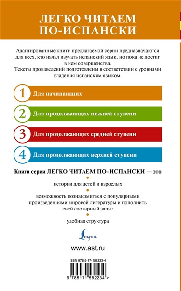 "Хитроумный идальго Дон Кихот Ламанчский" — знаменитый роман испанского писателя Мигеля де Сервантеса о разорившемся дворянине Дон Кихоте, возомнившем себя странствующим рыцарем, который отправляется в захватывающее путешествие вместе со своим верным оруженосцем Санчо Пансой. Теперь яркую сатиру, полную юмора, сюрпризов и приключений, могут прочитать даже те, кто только начал изучение испанского языка! Текст книги сокращён, адаптирован и сопровождается комментариями и упражнениями с ответами. Также в конце книги вы найдёте небольшой испанско-русский словарь, который поможет вам с выполнением заданий. Пособие предназначается для начинающих изучать испанский язык (уровень 1 — для начинающих А1–А2). Небольшой формат издания позволяет читать произведение как дома, так и в поездке.