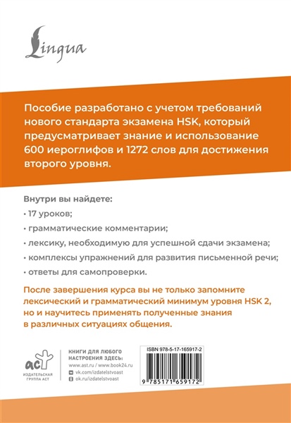 В основе пособия лежит лексический и грамматический минимум, необходимый для сдачи 2 уровня экзамена HSK версии 3.0. Книга состоит из 17 уроков, каждый урок содержит новые слова, диалоги, лексико-грамматические комментарии, а также упражнения, ответы к которым размещены в конце пособия. Разработанные комплексы упражнений направлены на развитие коммуникативных навыков и умения применять лексику и грамматику в различных ситуациях общения.