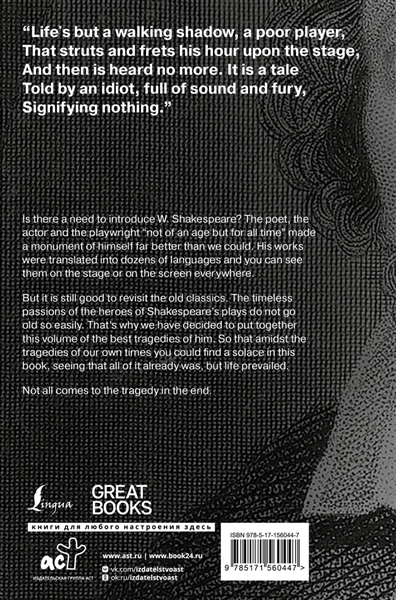 Издание на английском языке. Распалась связующая вас с английским нить? Шекспир поможет вновь её соединить! Его "Трагедии" неиссякаемый источник наслаждения для любителя английской литературы. Уильям Шекспир – поэт и драматург XVI-XVII веков, который едва ли нуждается в представлении. В этой книге мы собрали три его наиболее известные трагедии: "Гамлет", "Ромео и Джульетта" и "Макбет". Эти пьесы ярко и точно описывают человеческие страсти, рождая незабываемых персонажей. Текст представлен без сокращений и адаптации. Наслаждайтесь великими драмами Шекспира в оригинале!