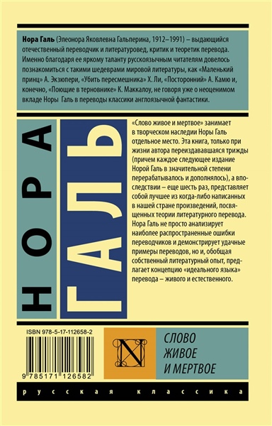 Слово живое и мертвое занимает в творческом наследии Норы Галь отдельное место. Эта книга, только при жизни автора переиздававшаяся трижды (причем каждое следующее издание Норой Галь в значительной степени перерабатывалось и дополнялось), а впоследствииеще шесть раз, представляет собой лучшее из когда-либо написанных в нашей стране произведений, посвященных теории литературного перевода.Нора Галь не просто анализирует наиболее распространенные ошибки переводчиков и демонстрирует удачные примеры переводов, но и, обобщая собственный литературный опыт, предлагает концепцию идеального языка переводаживого и естественного.