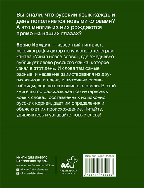 Вы знали, что русский язык каждый день пополняется новыми словами? А что многие из них рождаются прямо на наших глазах? Борис Иомдин — известный лингвист, лексикограф и автор популярного телеграм-канала "Узнал новое слово", где ежедневно публикует слово русского языка, которое узнал в этот день. И слова там самые разные: и недавние заимствования из других языков, и сленг, и шуточные слова-гибриды, еще не попавшие в словари. В этой книге автор рассказывает об интересных новых словах, составленных из исконно русских корней, дает им определения и объясняет их происхождение. Читайте, удивляйтесь и узнавайте новые слова!