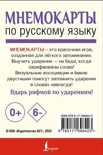 Перед вами набор карт, основанных на методе ассоциаций и мнемотехнике. Мнемотехника позволяет в игровой форме быстро запоминать постановку ударений, необходимых для заучивания в средней и старшей школах. Всего 10 минут в день с яркими карточками нужно для успехов в школе и на экзаменах.