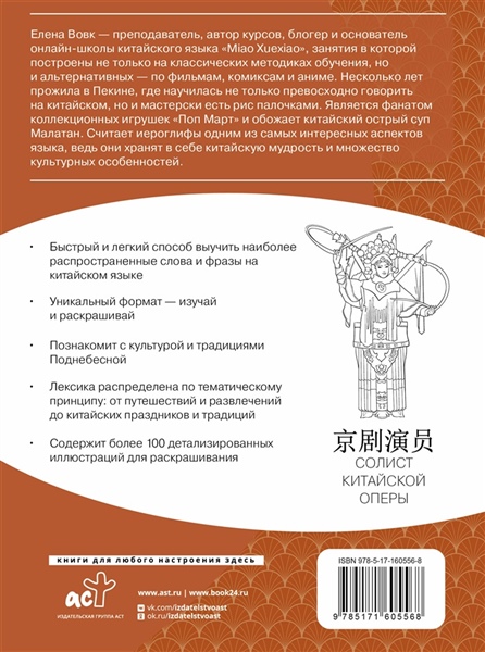 Елена Вовк — преподаватель, автор курсов, блогер и основатель онлайн-школы китайского языка "Miao Xuexiao", занятия в которой построены не только на классических методиках обучения, но и альтернативных — по фильмам, комиксам и аниме. Несколько лет прожила в Пекине, где научилась не только превосходно говорить на китайском, но и мастерски есть рис палочками. Является фанатом коллекционных игрушек "Поп Март" и обожает китайский острый суп Малатан. Считает иероглифы одним из самых интересных аспектов языка, ведь они хранят в себе китайскую мудрость и множество культурных особенностей. • Быстрый и легкий способ выучить наиболее распространенные слова и фразы на китайском языке • Уникальный формат – изучай и раскрашивай • Познакомит с культурой и традициями Поднебесной • Лексика распределена по тематическому принципу: от путешествий и развлечений до китайских праздников и традиций • Содержит более 100 детализированных иллюстраций для раскрашивания