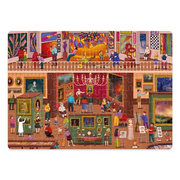Пазл из неповторяющихся элементов состоит из 100 деталей. Каждый пазл — это настоящая выставка музейных экспонатов! Все иллюстрации выполнены в стиле игры-квеста, где все изображения сочетают в себе разные кусочки историй, которые происходят с разными персонажами.