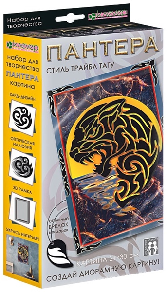 Набор «Пантера. Трайбл тату» разработан для создания оригинальной диорамной картины с хард-дизайном в стиле Трайбл тату. Основой для картины служат фэнтэзийный фон с яркими контурами и броская 3D рамка, а детали из чёрной самоклейки сложатся на прозрачном пластике в хищника-пантеру — благодаря двухуровневому расположению изображений картина приобретает эффект оптической иллюзии.