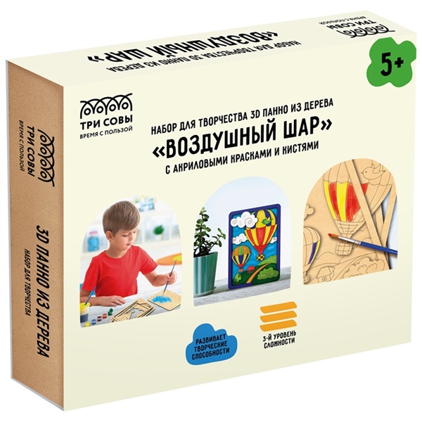 НАБОР Д/ТВОРЧ 3D ПАННО ИЗ ДЕРЕВА ТРИ СОВЫ ВОЗДУШНЫЙ ШАР С АКРИЛОВЫМИ КРАСКАМИ И КИСТЯМИ 3D_41937