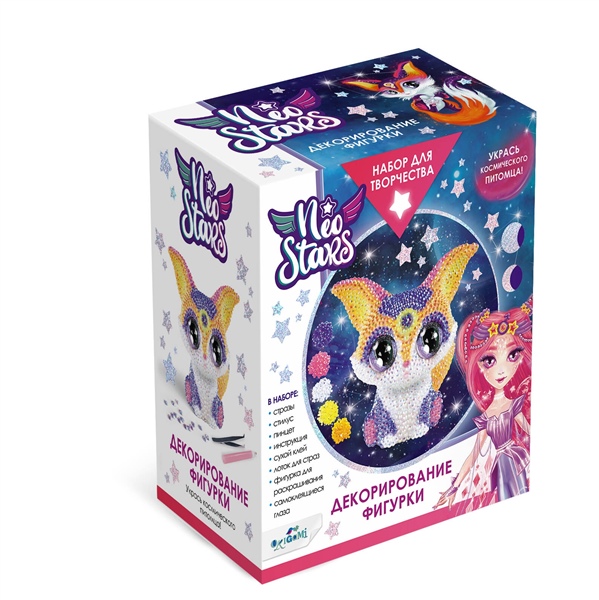 Космический набор от Neo Stars для декорирования фигурки стразами. В галактике Neo Stars существует космический набор для творчества, который позволяет погрузиться в мир невероятных блесков и великолепия. В его центре находится магическая фигурка, ожидающая своего создателя, чтобы ожить и заблестеть сиянием тысячи драгоценных страз.