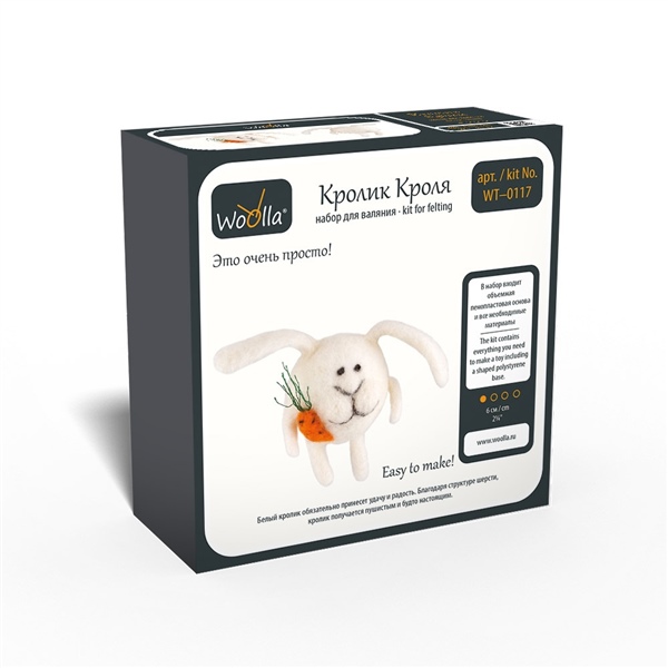 В набор входят все необходимые материалы для изготовления игрушки: игла для валяния, шерсть для валяния, основа для изделия, мулине "Gamma", пластиковый трафарет и подробная пошаговая инструкция с картинками. Белый кролик приносит удачу и радость. Благодаря структуре шерсти, кролик получается пушистым и будто настоящим.