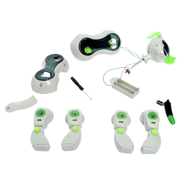 Вместе с малышом соберите модель согласно инструкции. Вставьте элементы питания в игрушку и наблюдайте за движениями робота.