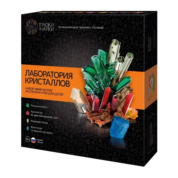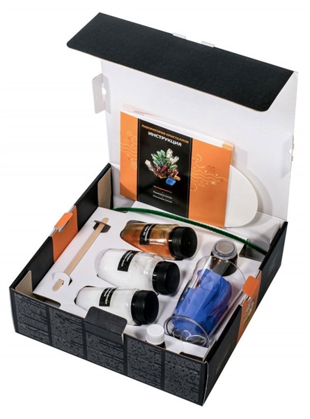 Набор химических экспериментов для детей, в который входит ингредиенты для создания 4х разных видов кристаллов: Поликристаллы. Это кристаллы, которые состоят из множества разноориентированных кристаллитов. Опыт демонстрирует быстрый рост кристаллов из насыщенного раствора дигидроортофосфата аммония. Кристаллы из красной кровяной соли. Этот опыт научит выращивать красивые кристаллы насыщеенного бордового цвета из гек- сацианоферрата калия (III) как в виде одного крупного кристалла, так и в виде множества кристаллический лучей. Монокристалл. Это отдельный однородный кристалл, имеющий непрерывную кристаллическую решётку. Медленно выращенный монокристалл почти всегда приобретает правильную геометриче- скую форму. Кристаллы из медного купороса. Опыт покажет как вырастить кристалл насыщенного синего цвета. Эффектным получается крупный монокристалл, но можно вырастить множество кристалликов на нитке или пуши- стой проволоке и сделать бусы или браслет.